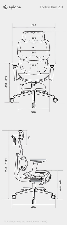 - FortisChair is suitable for people with height from 1.7m to 1.85m and weight from 50kg to 100kg.