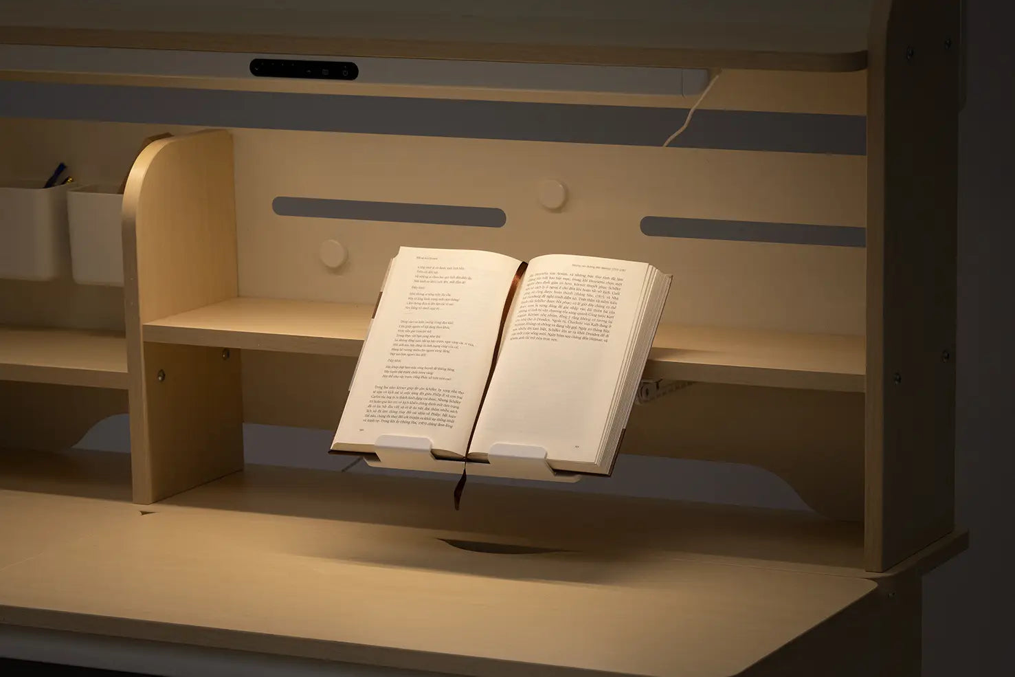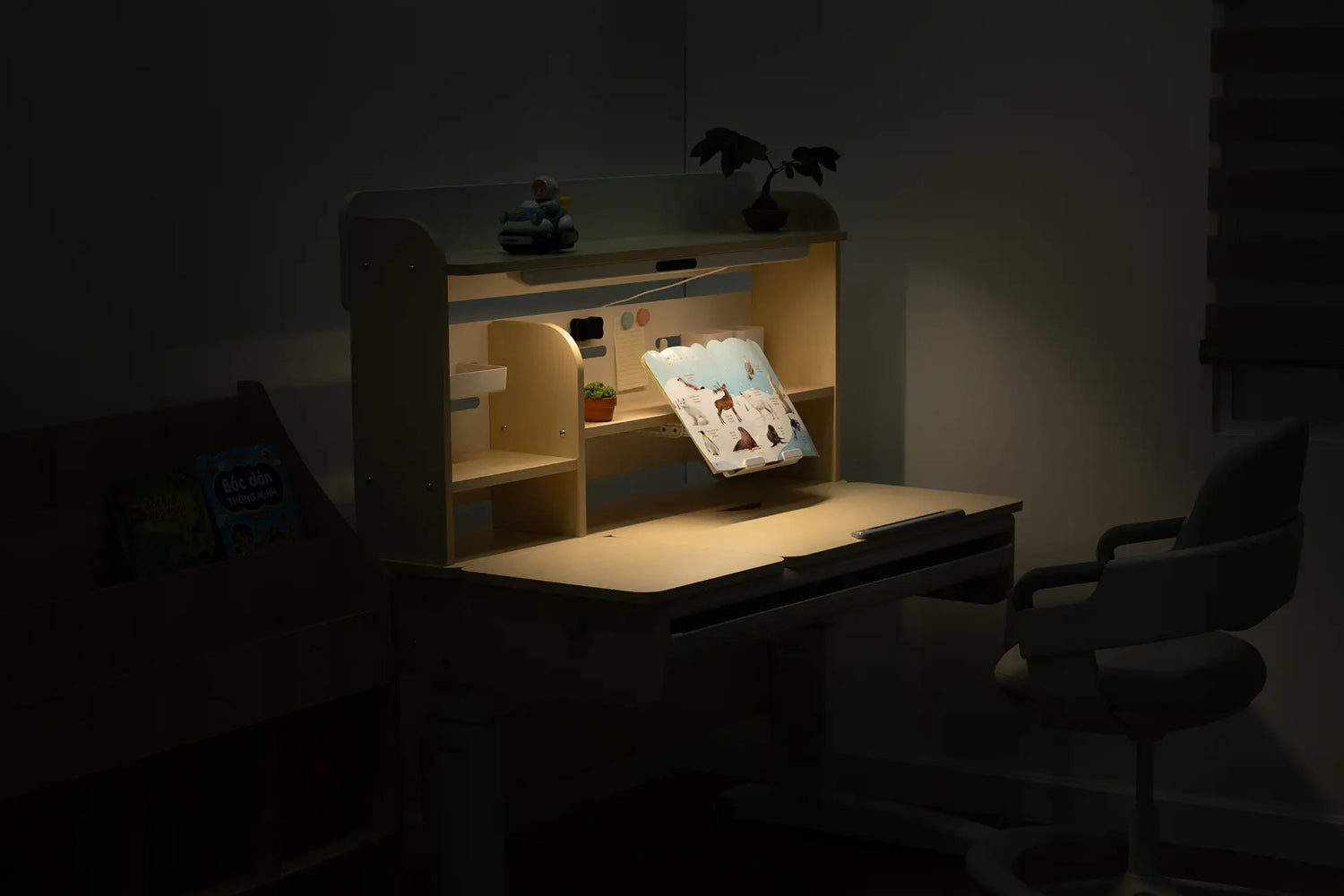 Thiết kế đặc biệt giúp ánh sáng được phân bổ đều khắp bàn học, loại bỏ hoàn toàn hiện tượng chói lóa hay vùng tối, giúp bé học tập hàng giờ mà không lo mỏi mắt.