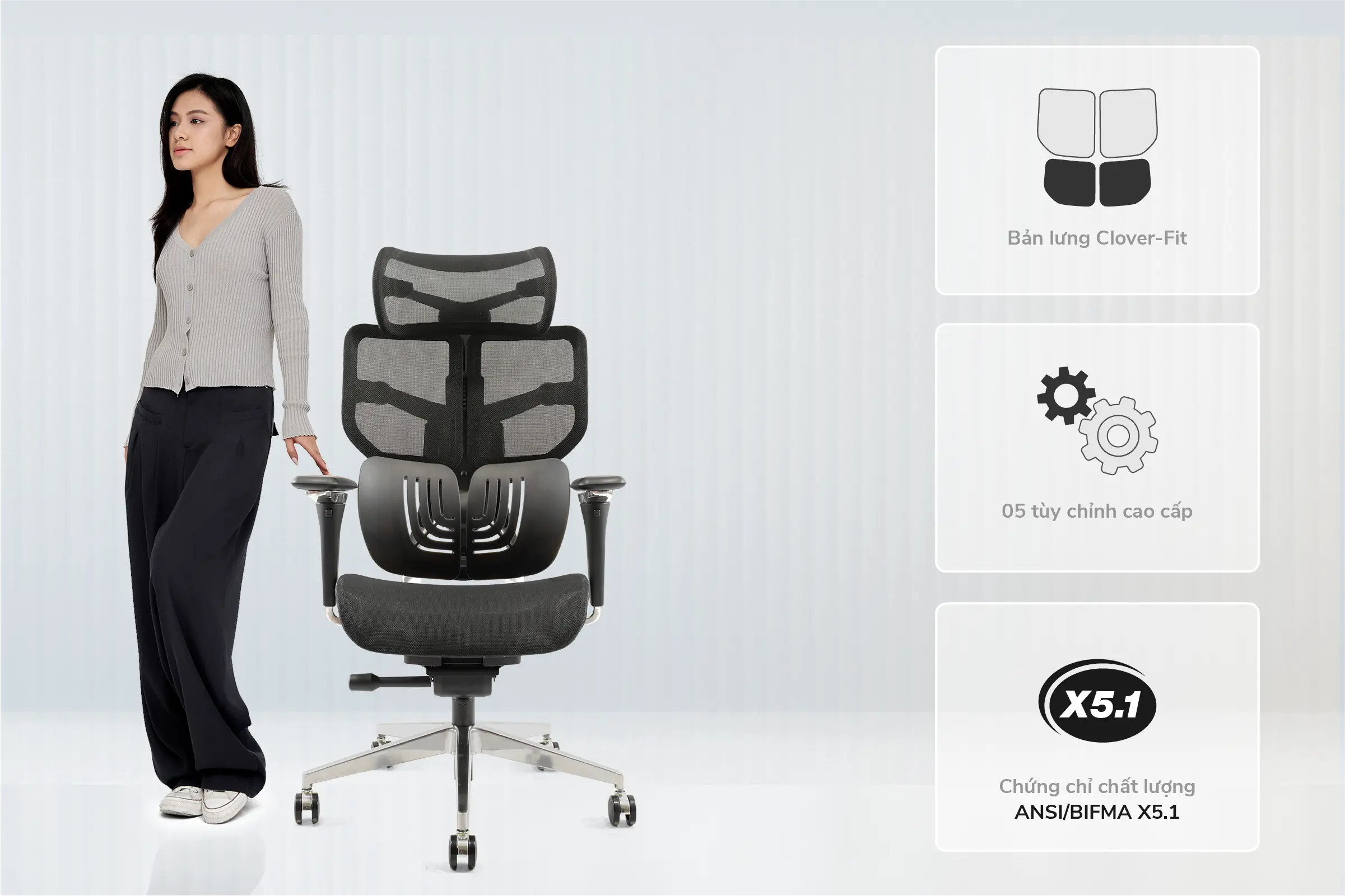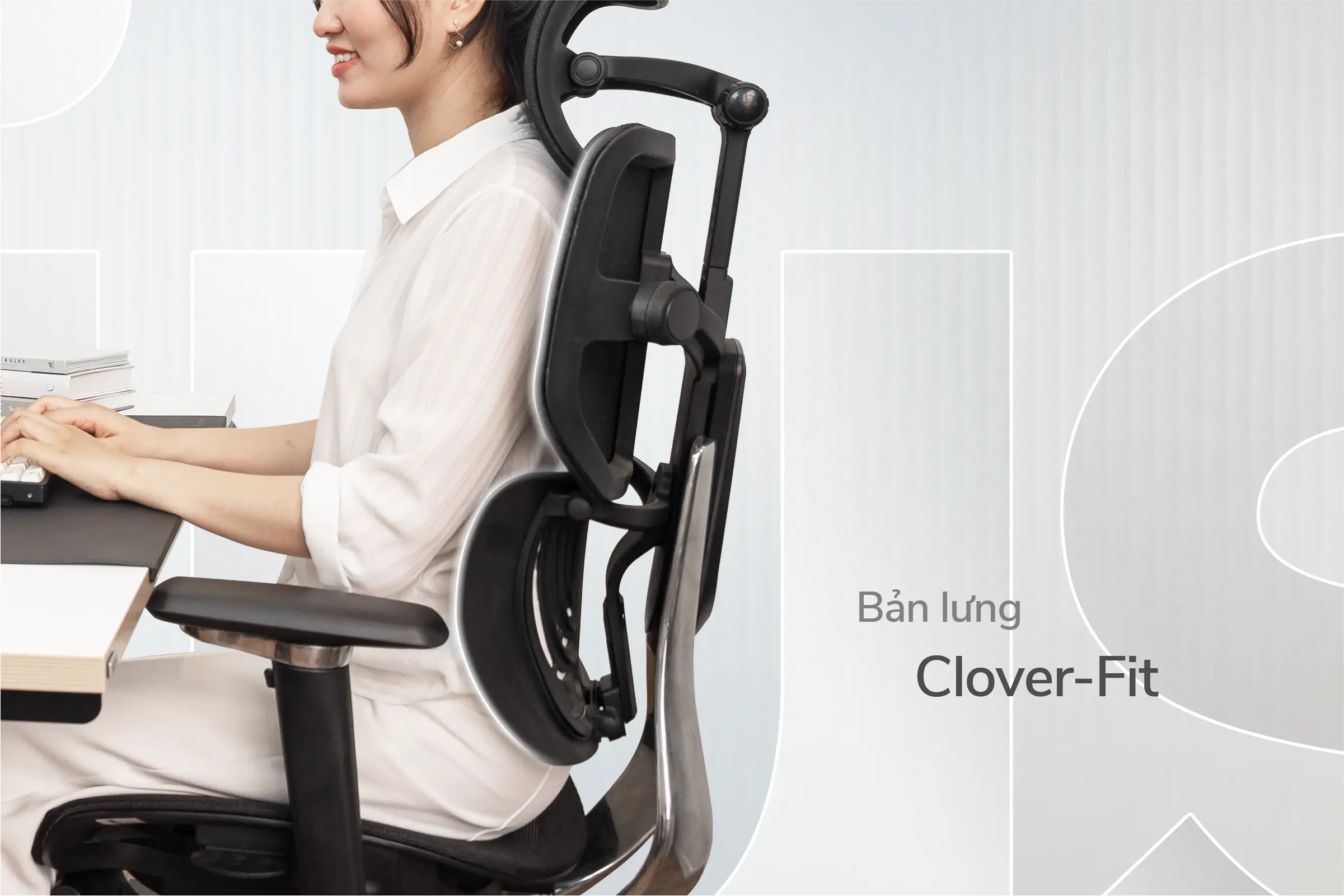 Tựa lưng Clover Fit lấy cảm hứng cỏ bốn lá, với 4 nấc khóa giúp tư thế ngồi ổn định từ vai đến eo, tự động nâng đỡ ở mọi điểm tiếp xúc, phù hợp với đa số thể trạng người Việt.